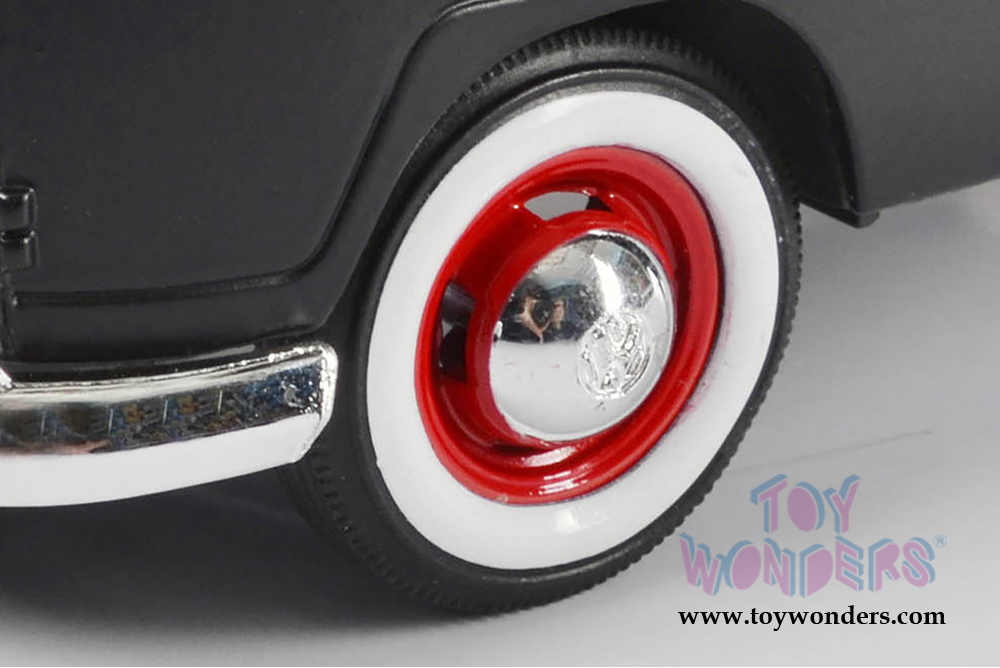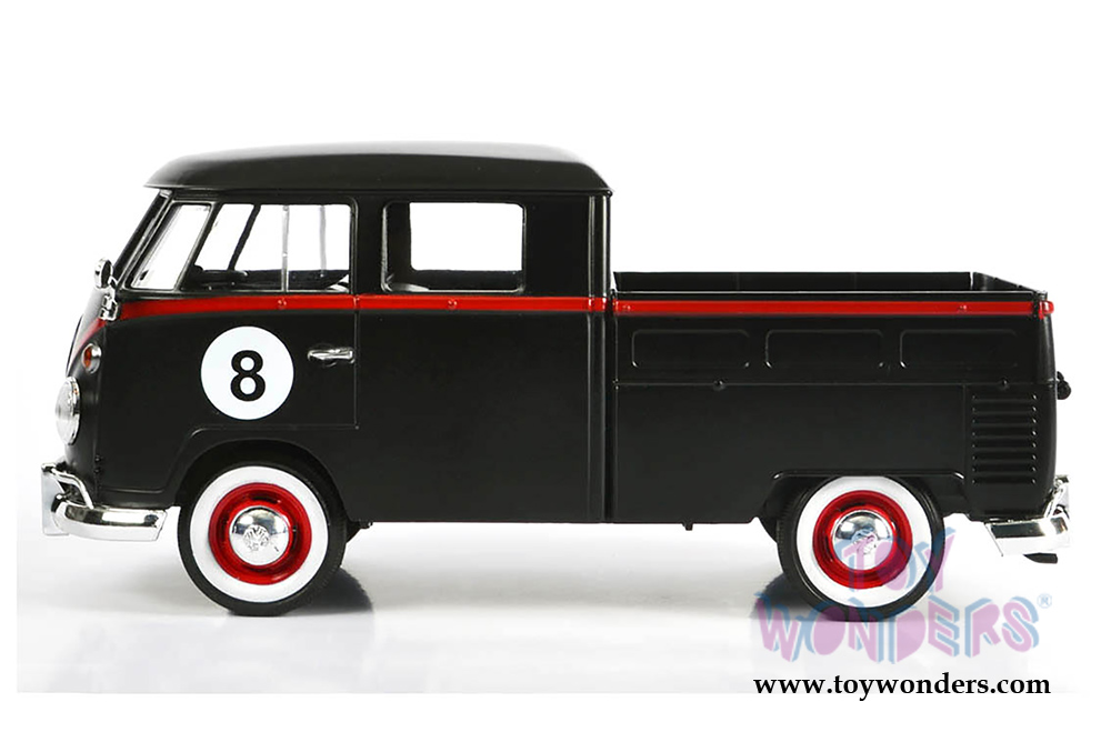 79562 Motormax - Volkswagen Type 2 (T1) Double Cab Pickup #8. 1:24 scale diecast model car. This VW Type 2 is a 7"L x 3"W x 3.5"H diecast metal car with opening rear gate. Detailed interior and exterior. This VW Van is manufactured by Motor Max. Individually packed in a window box. Window Box size: 10.5"L x 4.5"W x 5"H. Item 79562 is in matte BLACK.