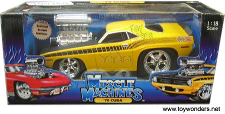 61180CG FUNLINE Muscle Machines - 1970 Plymouth Cuda. 1:18 scale diecast model car. Real steel braided fuel lines. YELLOW color.