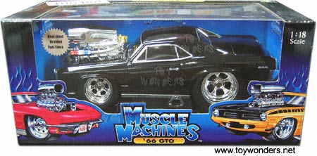 61192GB FUNLINE Muscle Machines - 1966 Pontiac GTO. 1:18 scale diecast model car. Real steel braided fuel lines. BLACK color.
