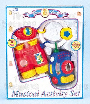 07022 Musical Activity Set. Each set includes three different toys attached to a ring w/ musical tunes and lights. Assorted styles. In a TRY ME box. Batteries included. For ages 3 months & up. Box size: 9.5"Lx2.5"Wx11.5"H. 12 pcs/inner.