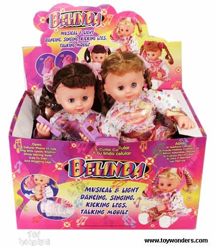 13151/2SCF Musical Belinda Doll with mobile phone. 12" battery operated doll with light. Opening the celIular phone, the doll will talk, sing with lovely song while moving body side to side and wiggling legs. Uses 2 "AA" batteries (not included). Assorted styles. 6 pcs per display box.
