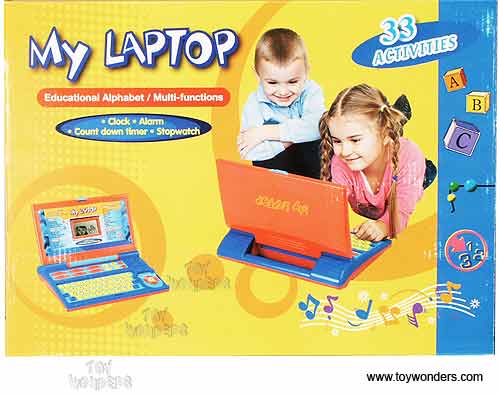 852V Battery Operated My Laptop. Educational alphabet / multi-functions computer features 33 activities, clock, alarm, count down timer, letters, words, 12 games, melodies, numbers & calculator. This PC is for ages 3+ years. Includes 3 "AA" batteries. Box size: 13"Lx 9.5"Wx 2.3"H.