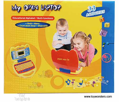 86V Battery Operated My Own Laptop. Educational alphabet / multi-functions computer features 33 activities, clock, alarm, count down timer, stopwatch, letters, words, 12 games, melodies, numbers & calculator. This PC is for ages 3+ years. Includes 3 "AA" batteries. Box size: 13"Lx 10.75"Wx 2.25"H.