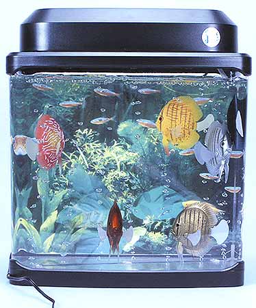 WD9905B Nature Aquarium - Saltwater (rectangular shape). Animated saltwater aquarium w/ beautiful sceneries. The fish's swimming action and the movement of their tails are incredibly realistic. It is almost impossible to tell them apart from real fish. Very low maintenance and NO FEEDING required!!! Uses regular tap water with perpetual bubbles flowing through the aquarium. AC power adapter included. Each aquarium includes six angel fish and coral background. Rectangular aquarium size: 12"W x 13.75"H x 4.75"W. AC ADAPTER INCLUDED.