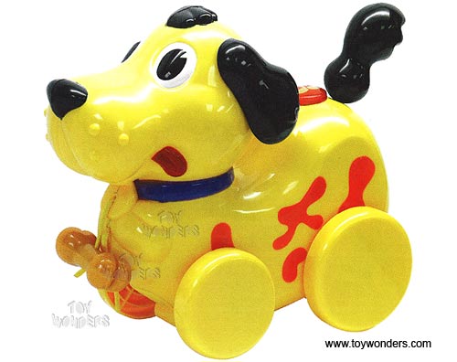 63977F Navystar Toys - Musical Doggy. 8.5" dog features roll along action. Press buttons to play 11 songs with light. Includes 2 "AA" batteries. Ages 18 months & up. Box size: 9"L x 4"W x 8.125"H.