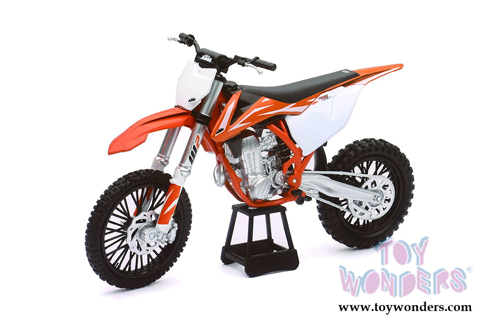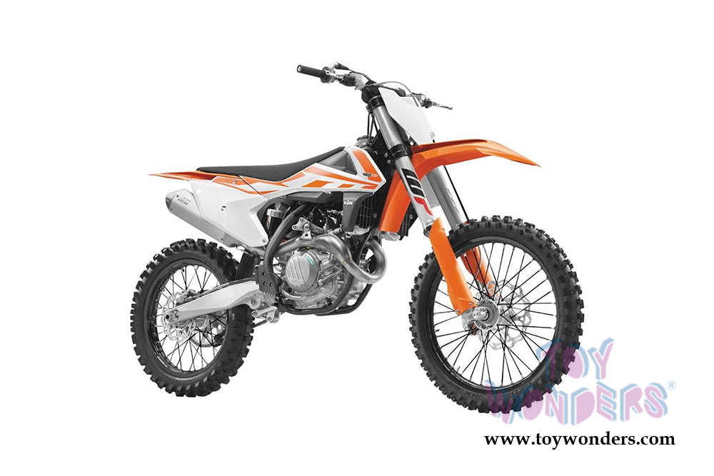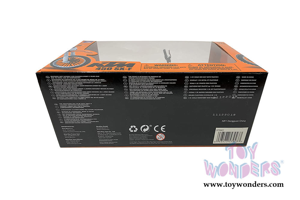 57943 New Ray - 2018 KTM 450 SX-F Dirt Bike. 1:10 scale diecast collectible model. This Bike is 8"L x 1.75"W x 4.25"H. Diecast metal, workable steering. This Bike is manufactured by New Ray. Individually packed in a window box. Box size: 9"L x 2.5"W x 8"H. 57943 is in Orange.