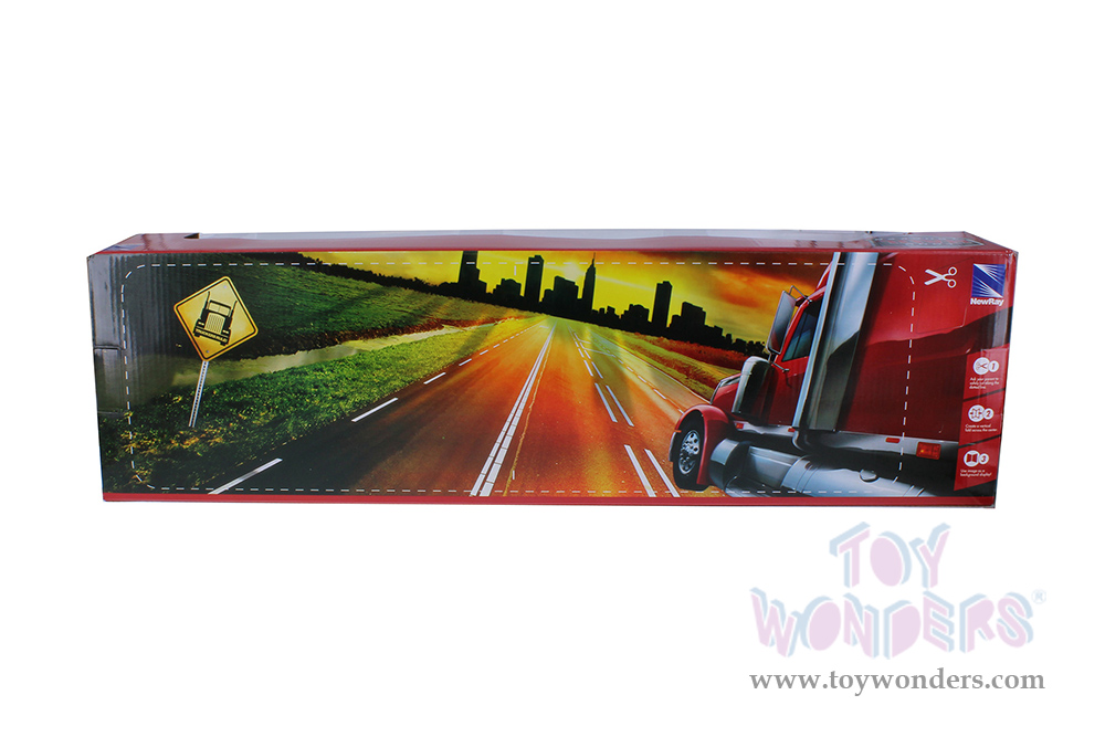SS-10263A New Ray - Long Haul Trucker | Kenworth® W900 Flatbed with Forklift and Pallets. 1/32 scale friction powered truck. Long Hauler is a 23"L x 3"W x 5"H diecast metal with durable plastic parts. Openable doors and hood. This trailer is manufactured by New Ray. Packed in a window box. Box size: 24"L x 4"W x 7"H. SS-10263A is in Black hauler and Red Cab.