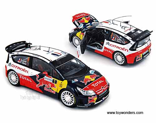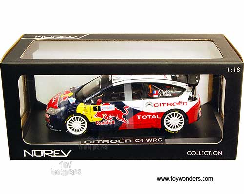 181551 Norev - Citroen C4 WRC Race Car #1 - Winner Rallye d' Alsace 2010 Loeb/Elena. 1:18 scale diecast collectible model. This Citroen C-4 WRC is a 9.25"L x 3.75"W x 3"H die-cast metal car with openable hood & doors. Sits on a display plaque. This Citroen C4 WRC racing car is manufactured by Norev. Individually packed in a window box. Box size: 13"L x 6.5"W x 5.75"H. Sponsored by Red Bull, Total, Sabelt, Transsalliance, Firelli, and more.