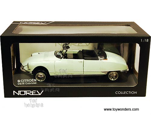 181562 Norev - Citroen DS19 Cabriolet Convertible w/ Removable Bonnet. 1:18 scale diecast collectible model. This Citroen DS-19 Cabriolet is a 10.5"L x 3.5"W x 3"H die-cast metal car with openable hood, doors & trunk. Sits on a display plaque. Item 181562 is in LIGHT GREEN color. This Citroen DS19 Cabriolet is manufactured by Norev. Individually packed in a window box. Box size: 12.75"L x 6.5"W x 5.75"H.