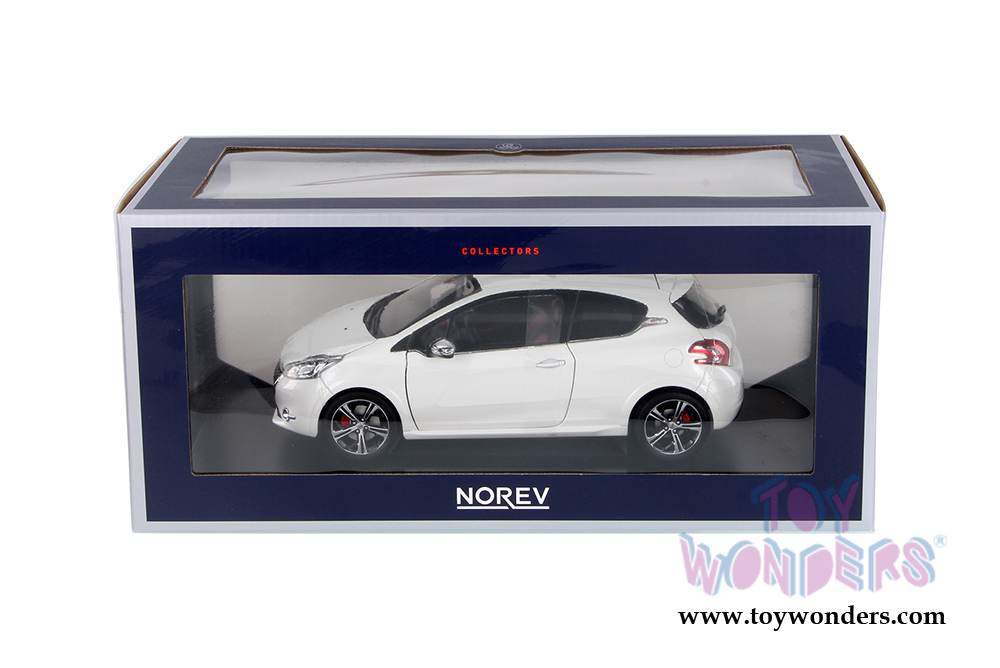 184824 Norev - 2013 Peugeot 208 GTI Hardtop. 1:18 scale diecast collectible model. This Peugeot 208 GTI is an 8.25"L x 3.5"W x 3"H die-cast metal car with steerable wheels, openable hood, doors, and hatchback. Sits on a display plaque. This Peugeot 208 GTI is manufactured by Norev. Individually packed in a window box. Box size: 13"L x 6.5"W x 5.75"H. 184824 is in Pearl WHITE.