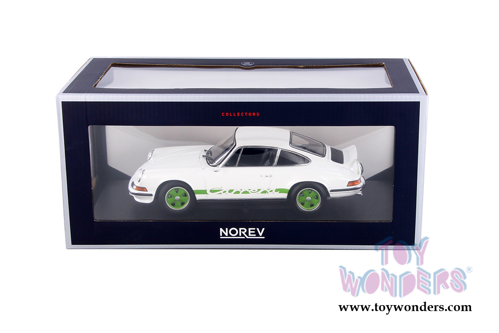 187636 Norev - 1973 Porsche 911 RS Touring Hardtop. 1:18 scale diecast collectible model. This Porsche is 8.75"L x 3.5"Wx 2.75"H diecast metal car. Sealed car, steerable wheels, rubber tires, detailed interior and exterior. This '73 Porsche 911 is manufactured by Norev. Individually packed in a box. Box size: 13"L x 6.5"W x 5.75"H. Item 187636 is in WHITE with green stripes.