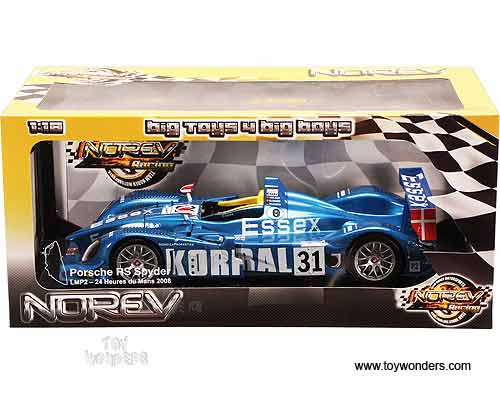 187519 Norev Racing - 2008 Porsche RS Spyder #31 Le Mans Series - Team Essex. 1:18 scale diecast collectible model. This Porsche RS Spyder is a 10"L x 4"W x 2"H high die-cast metal race car. Sits on a display plaque. Item 187519 is in BLUE color. This Porsche RS Spyder is manufactured by Norev. Individually packed in a window box. Box size: 12.75"L x 6.5"W x 5.75"H.