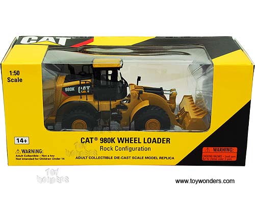 55296 Norscot - Cat 980K Wheel Loader - Rock Configuration. 1:50 scale diecast collectible model. This Caterpillar 980K Wheel Loader is a 7.75"L x 2.75"W x 3.125"H die-cast metal model. Manufactured by Norscot. 55296 is in YELLOW color. Individually packed in a window box. Box measures 9.5"L x 4.25"W x 4.25"H.