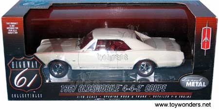 50105W HIGHWAY 61 Oldsmobile 4-4-2 Coupe (1967). 1:18 scale diecast model. This 67 Olds is a diecast metal collection car with opening hood/doors/trunk and detailed V-8 Engine. Provincial White color car with red interior. This 1967 Oldsmobile is manufactured by F.F. Ertl III, Inc. WHITE color.