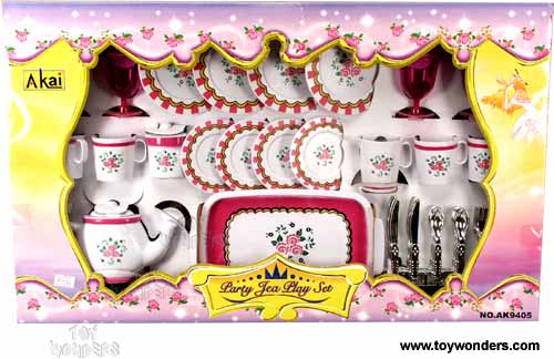 AK9405 Party Tea Play Set. 46 pcs tea set that includes cups, plates, tea pot, utensils, four placemats, silverware and more. Assorted styles. Box size: 22.25"Lx 13.75"Wx 2.5"H. 6 set per inner box.