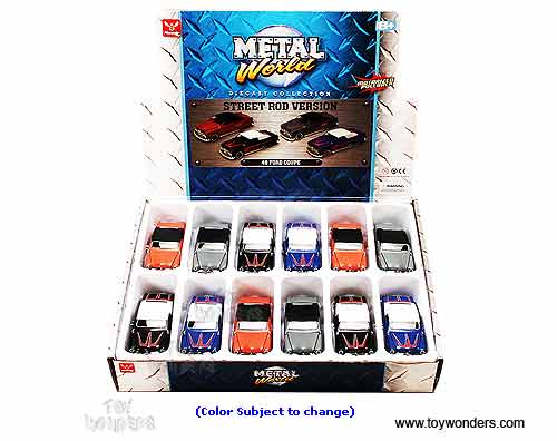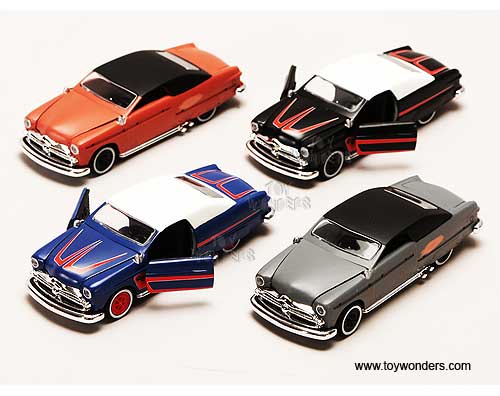 58006D Phoenix - 1949 Ford Coupe. 1:35 scale diecast collectible model car. This Ford Coupe measures 5.25"L x 1.75"W x 1.25"H die-cast metal car with pullback motor action and openable doors & hood. The 1949 Ford Coupe is manufactured by Phoenix. 48 pcs per inner box. 12 pcs per display box in assorted colors.