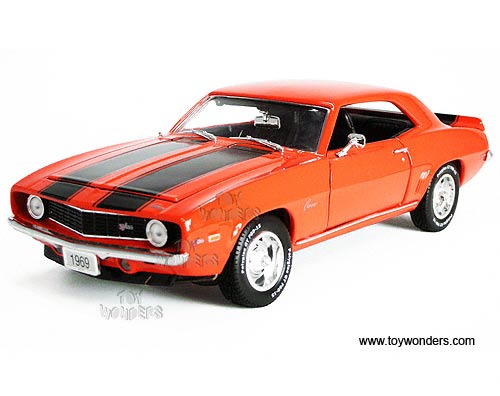 18685 Phoenix Unique Replicas - 1969 Chevy Camaro Z-28 Hard Top. 1:24 scale diecast collectible model car. This Chevrolet Camaro Z28 measures 7.5"L x 3"W x 2"H die-cast metal car with openable hood, doors & trunk. Manufactured by Phoenix. 6 pcs per inner box. 18685 is in ORANGE color with Black stripes. Individually packed in a window box. Box size: 10"L x 4.75"W x 4"H. GM is a trademark of the General Motors Corporation.