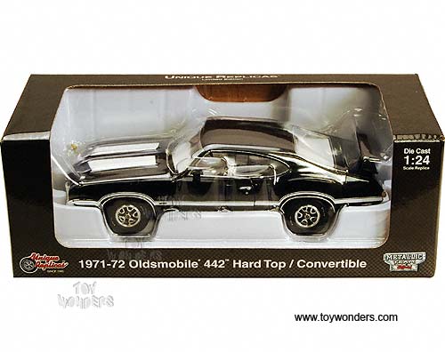 18705 Phoenix Unique Replicas - 1971 Oldsmobile 442 Hard Top. 1:24 scale diecast collectible model car. This Oldsmobile 442 is an 8.5"L x 3"W x 2.25"H die-cast metal car with openable hood, doors & trunk. Manufactured by Phoenix. 6 pcs per inner box. 18705 is in BLACK color with White stripes. Individually packed in a window box. Box size: 11"L x 4.75"W x 4"H. GM is a trademark of the General Motors Corporation.