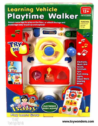 33875W Battery Operated Playtime Walker. This Learning vehicle features electronic, music, sound, lights & steering wheel. Detach table legs to play on the floor, or attach the legs to encourage baby to pull up and explore. Comes with shape blocks. Requires 3 "AA" batteries. For 12 months and up. Packed in a "Try Me" box. Box size: 14"Lx 7.8"Wx 19.3"H.