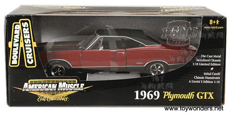 33815R ERTL - American Muscle Plymouth GTX (1969). 1:18 scale diecast model car. This 1969 Plymouth GTX is an 11.25"L diecast metal with opening hood and doors. Black color interior, balck stripes on hood, and black roof. Firestone Drag 500 tires. Limited Edition 1 of 5000 pcs. This 69 Plymouth is manufactured by RC2 Brands. Boulevard Cruisers. RED color.