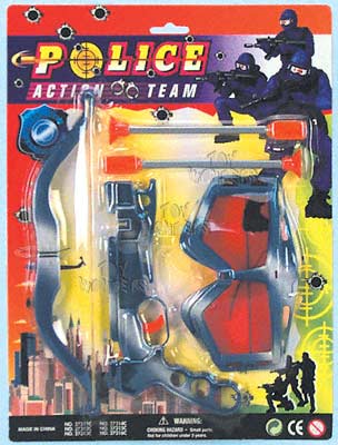 27319/2 Police Action Team. Police play sets in assorted styles include night vision goggles, Billy club, gun that shoots suction cup dart, bow w/ suction cup arrow, and more. Card size: 14"x10.25". 24 pcs/inner.