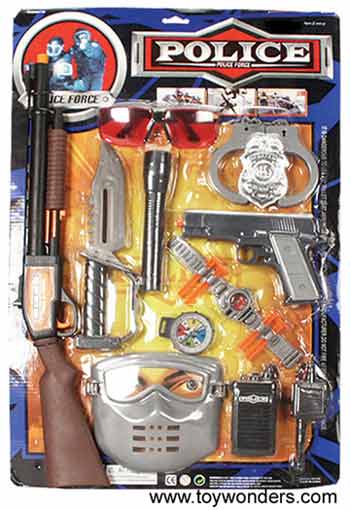 5528 Police Force Set. The set includes 19" machine gun, soft darts, 6.5" cap gun, handcuffs, mask, knife, and more. Card size: 14.5"x22".