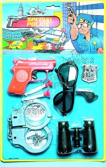 215/9 Police Set with lots of law enforcement stuff. Includes a dart gun with two darts, handcuffs, badge, sunglasses, whistle & binoculars. Blister card size: 9.5"x15". 12 pcs/inner.