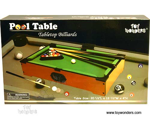 2010 Pool Table. This wood grain finished Tabletop Billiards game play set includes 16 balls, 2 wooden cue sticks, brush, and chalk. Fully Assembled. Table size: 20.5"L x 12.5"W x 4"H. Individually packed in a box. Box size: 21"L x 12.75"W x 4.5"H.