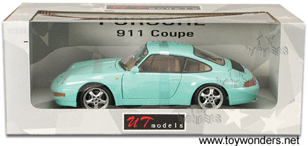 27801 UT Models Porsche 911 Coupe. 1:18 scale diecast model. This Porsche 911 Coupe is a 9" long diecast sports car with opening doors/hood/trunk and detailed component and engine. Display stand. MINT GREEN color.