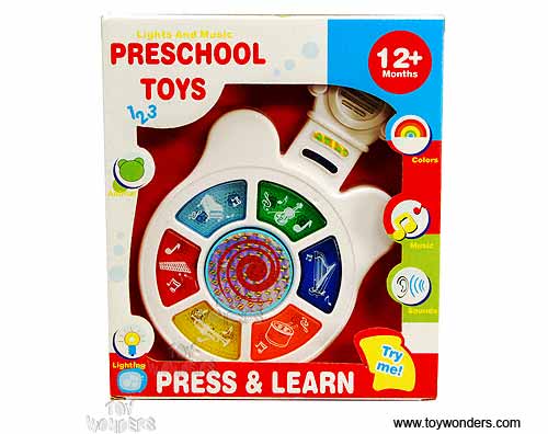 8035AB Preschool Musical Instruments w/ Lights & Music. This Musical Instrument features six buttons with flashing lights, different sounds and melodies. Includes 2 "AA" batteries. Box size: 9.25"L x 8"W x 2.5"H. 8035AB is in assorted styles. For 12 months and up. 18 pcs per inner.