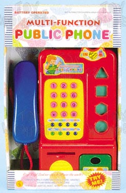 SC363T Public Phone. Public phone that stands up w/ coins to insert, sound effects, 36 melodies, messages, and much more. In a TRY ME box. Includes 2 "AA" batteries. Box size: 9.25"Lx4"Wx15"H.