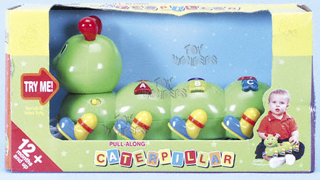 661E Pull-Along Caterpillar. With movements, melodies, lights, digital voice of ABCs, 123's & shapes. For ages 12 months and up. "Try Me" box. 6 pcs/inner.