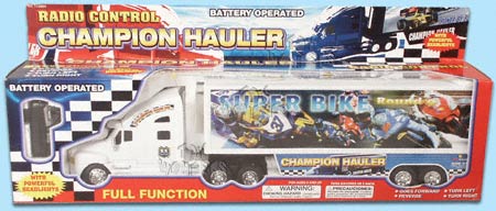 11299N Radio Controlled Champion Hauler. 21.5" full-functioning hauler goes forward/reverse & left/right. 4 "AA" batteries (not included). 11299 in assorted colors. Box size: 24.5"L x 4.5"W x 6.5"H. Note: This item contains no any diecast metal.