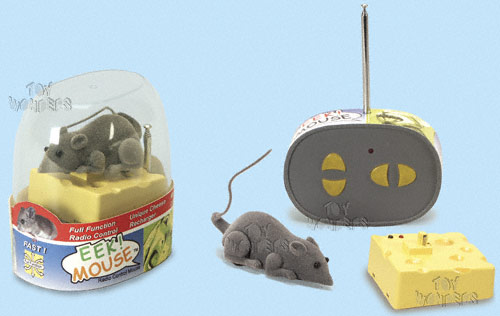 20032 EEK! Mouse. Radio Control Mouse/R.C. mouse with fast moving/running legs, full function (moves forward, reverse, and turns), RC controller, and a unique cheese recharger. R/C mouse is 3.75" long and has a fuzzy texture. Plastic dome packaging is 4.25"W x 4.5"H x 3"D. Instructions included. Uses 4 "AA" batteries (not included) and mouse has built-in rechargeable battery. Assorted mouse colors (GREY or WHITE). Label colors and frequencies. Fun for people (ages 3 and up) and pets too. Note: This item contains no any diecast metal.