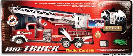 0506 R/C Fire Engine. 19.5" R/C fire truck features: rotating ladder, flashing lights, realistic siren sound. Shoots water up to distance of 6m (19.6'). Includes transmitter, rechargeable batteries and 120V charger. Requires 8 "AA" (not included). Note: This item contains no any diecast metal.