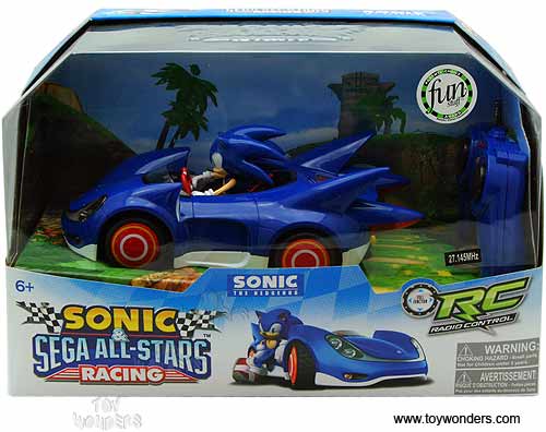 611 R/C Sonic Sega All-Stars Racing Vehicle with Lights. This Sonic The Hedgehog is 7.5" long radio controlled race cars with full function, and 27.145MHz. Includes transmitter. Requires 6 "AA" batteries (not included). Each car individually packed in a window box. Box size: 11.5"L x 5.25"W x 7.5"H. 611 is in BLUE color. Note: This item contains no any diecast metal.