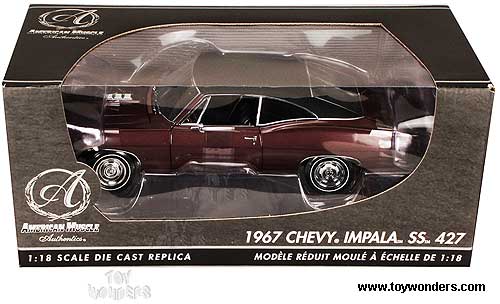 CC39298 RC2 ERTL American Muscle Authentics Chase Car - Chevy Impala SS 427 Hard Top. 1:18 scale diecast collectible model car. This Chevrolet Impala SS-427 is an 11.5"Lx 4.25"Wx 3"H die cast metal car with openable doors, hood & trunk, realistic headlights & taillights, retractable radio antenna, and highly polished electro-planted chrome parts. Interior features steering wheel and front wheels turn together, and sliding bench seat with folding seatback. Engine features detailed 427 cid engine with diecast oil pan and transmission, soft heater hoses, separate battery and cables, full engine compartment labels and decals. Undercarriage features working front and rear suspension. This Chevy Impala SS427 Chase car is manufactured by RC2 Brands. Individually packed in a window box. Box size: 13.75"Lx 6.25"Wx 5.75"H. 39298 chase car is in PURPLE color with Black vinyl roof (Regular production model has a Purple colored hardtop roof). GM is a trademark of the General Motors Corporation.