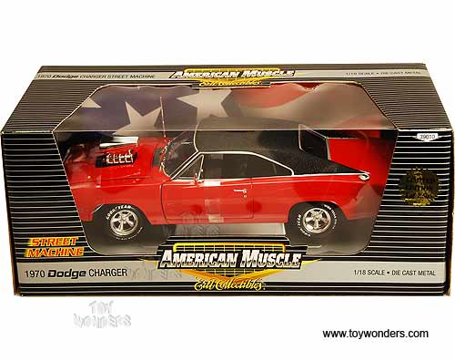 39010R ERTL American Muscle - 1970 Dodge Charger Hard Top Street Machine. 1:18 scale diecast collectible model car. This 1970 Dodge Charger is an 11.5" diecast muscle car with openable doors & hood and workable steering. Limited Edition 1 of 2,500. American Muscle. This 1970 Charger is manufactured by RC2 Brands; ref. no 39010 in RED color with black top. Individually packed in a window box.