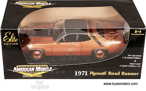). This 1971 Plymouth Road Runner Chase car is manufactured by RC2 Brands. Individually packed in a window box. Box size: 13.5"Lx 6.25"Wx 5.75"H. 39490 chase car is in AUTUMN BRONZE color with Black vinyl roof (Regular production models have Autumn Bronze hard roof.)