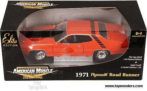 CC39397 ERTL Elite American Muscle Chase Car - 1971 Plymouth Road Runner Hard Top. 1:18 scale diecast collectible model car. This Plymouth Road Runner is an 11.25"Lx 4.25"W x 2.5"H die cast metal car with openable doors, hood & trunk, detailed interior & chassis, and steerable front wheels. Sits on a display platform. This 1971 Plymouth Road Runner is manufactured by RC2 Brands. Individually packed in a window box. Box size: 13.75"Lx 6.25"Wx 5.75"H. 39397 chase car is in ORANGE color with Orange seats (Regular production models are with Black seats).