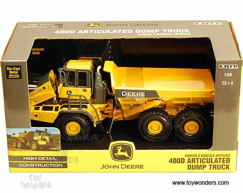 15252 RC2 ERTL John Deere - 400D Articulated Dump Truck. 1:50 scale diecast collectible model. This 400D Articulated farm tractor is a 7.75"L x 3"W x 3.25"H die-cast metal with openable hood & dumpable bed. Individually packed in a window box. Box size: 9.5"L x 4.75"W x 5"H. This 400D Articulated Dump Truck farm tractor is manufactured by RC2 Brands. Item 15252 is in ORANGE color.