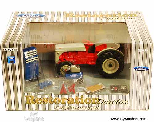 13780 RC2 ERTL Restoration - Ford 8N Farm Tractor w/ Accessories. This diecast collectible tractor is 1:16 scale about 6.25"L x 3.5"W x 2.75"H. Assessories include 3-drawer & 2-drawer tool boxes, floor jack, two jack stands, car creeper, hand-drill kit,  and air compressor. Individually packed in a window box. Box size: 12.75"L x 8"W x 6.5"H. This farm tractor is manufactured by RC2 Brands. Item 13780 is in ORANGE & BEIGE 2-tone colors.