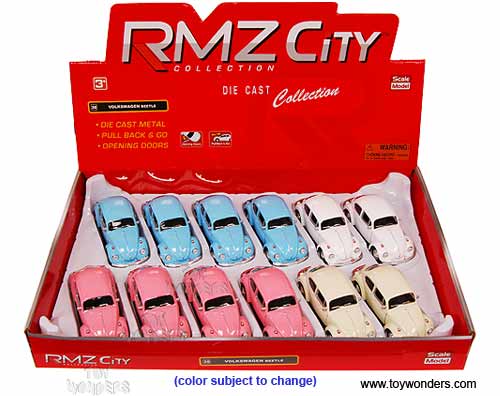 555017 RMZ City - 1967 Volkswagen Beetle Hard Top. 1:32 scale diecast collectible model car. This VW Beetle is a 5"L x 2"W x 1.75"H die cast metal car with pull back action and openable doors. This 67 Volkswagen Beetle is manufactured by Uni-Fortune. 12 pcs per display box in assorted colors.  48 pcs per inner box.