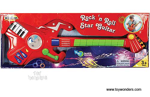 2051NL Battery Operated Rock 'n Roll Star Guitar. This multi-activity rock instrument is 23.5" long. For ages 3+ years. Includes 3 "AA" batteries. Box size: 24.25"L x 9.25"W x 2.5"H. It features: