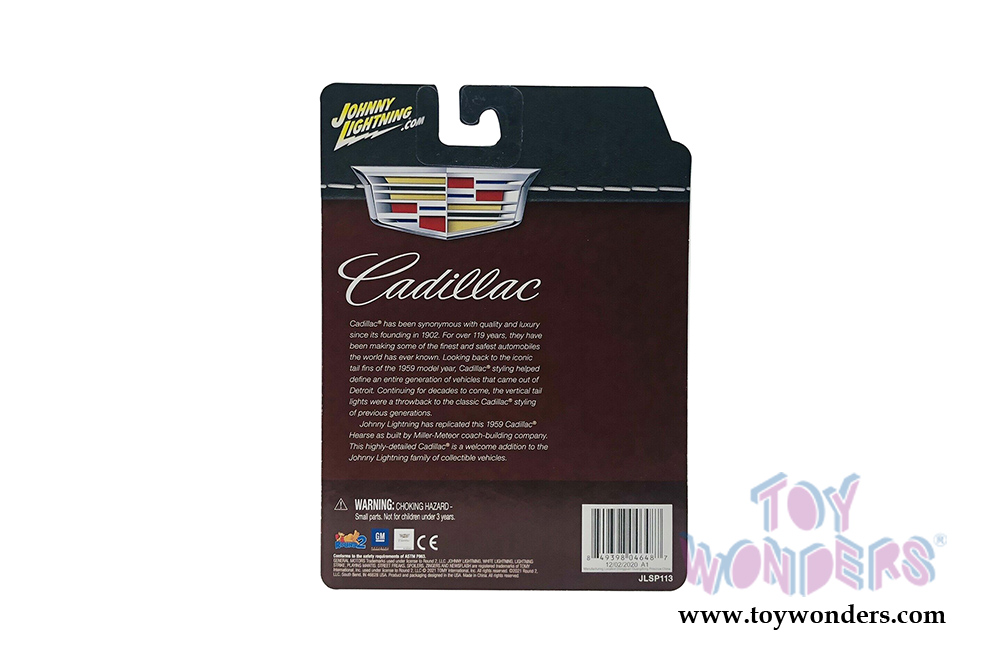 JLSP113/24 Round 2 Johnny Lightning - 1959 Cadillac® Hearse. 1:64 scale diecast collectible model. 6-car set. These cars are 3" long. Special Edition. 6 pcs/inner. Manufactured by Round 2. Each car individually blister carded. Card size: 5.5" x 7.5". Item JLSP113/24 is in Brown.