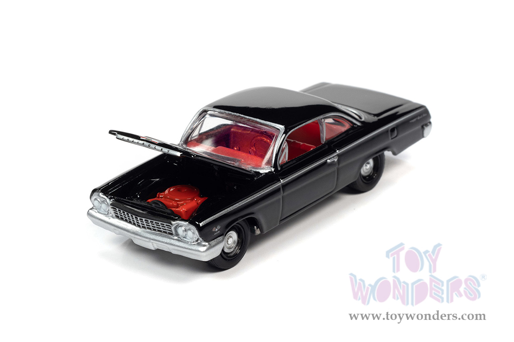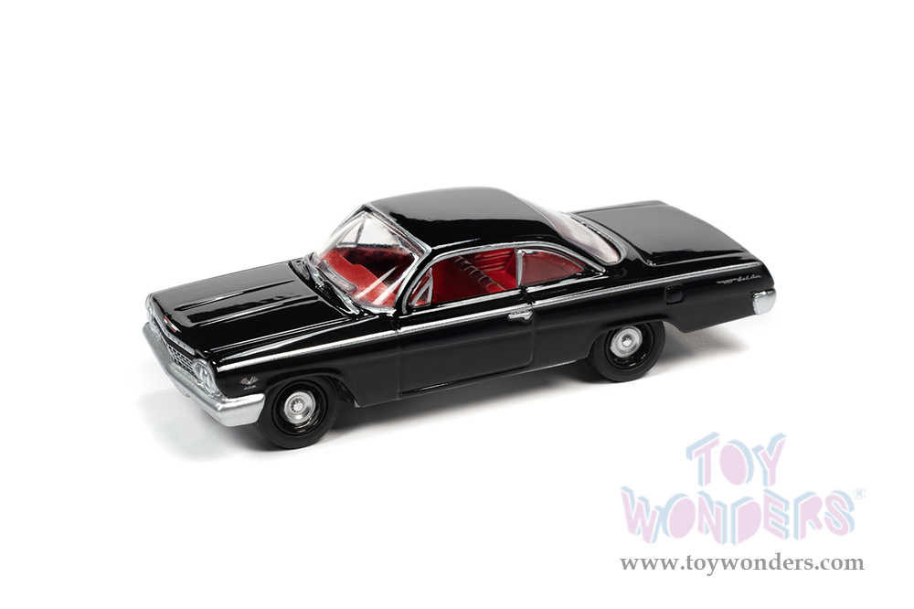 JLSP187/24B Round 2 Johnny Lightning - Classic Gold 2021 Release 4 Set B | 1962 Chevrolet® Bel Air® Bubbletop. 1:64 scale diecast collectible model. 6-car set. These cars are 3" long. Authentic factory colors, vehicles match photo card images, openable hood with detailed engine. Limited Edition to 15100 pcs. 6 pcs/inner. Manufactured by Round 2. Each car individually blister carded. Card size: 5.5" x 7.5". Item JLSP187/24B is in Tuxedo Black.
