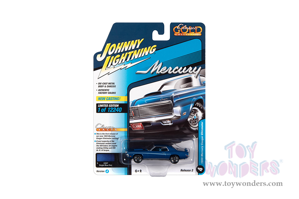 Round 2 Johnny Lightning - Classic Gold 2022 Release 2 Set A | Mercury Cougar Eliminator (1969, 1/64 scale diecast model car, Bright Blue Metallic) JLSP246/24A