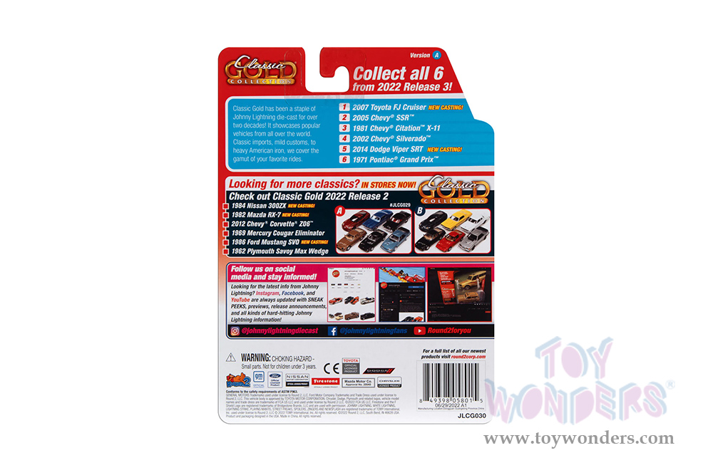 JLSP279/24A Round 2 Johnny Lightning - Classic Gold 2022 Release 3 Set A | 2005 Chevy® SSR™. 1:64 scale diecast collectible model. 6-car set. These cars are 3" long. Authentic factory colors, vehicles match photo card images, does not have any openings. Limited Edition to 8476 pcs. 6 pcs/inner. Manufactured by Round 2. Each car individually blister carded. Card size: 5.5" x 7.5". Item JLSP279/24A is in Bermuda Blue with White stripes.
