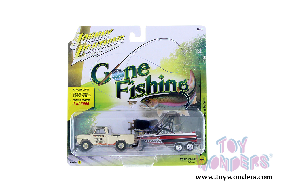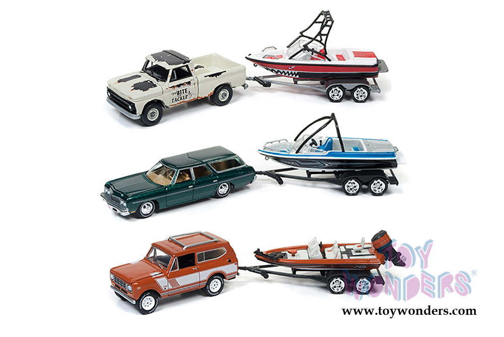 JLBT004/36B Round 2 Johnny Lightning - Gone Fishing 2017 Release 4 Set B. 1:64 scale diecast collectible model car. These cars and boats are approx. 3" long. With authentic factory colors, opening hoods, 6-Car Set. Hitched to each vehicle is a matching trailer and diecast boat. Limited quantities. 3000 per vehicle produced. Factory sealed case and Limited Edition. Manufactured by Round 2. Each set individually blister carded. Card size: 7.5" x 7.5".