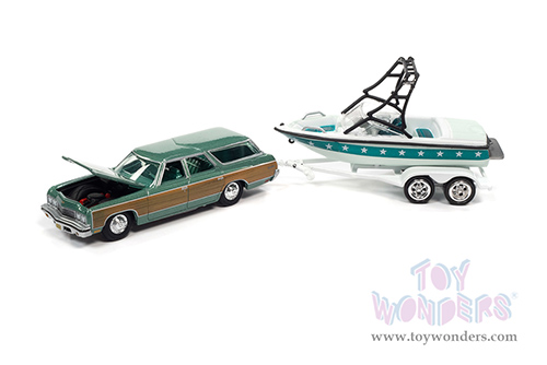 Round 2 Johnny Lightning - Hulls & Haulers Release 1 | Chevrolet® Caprice with Mastercraft Boat & Trailer (1973, 1/64 scale diecast model car, Light Green Poly) JLSP204/24A